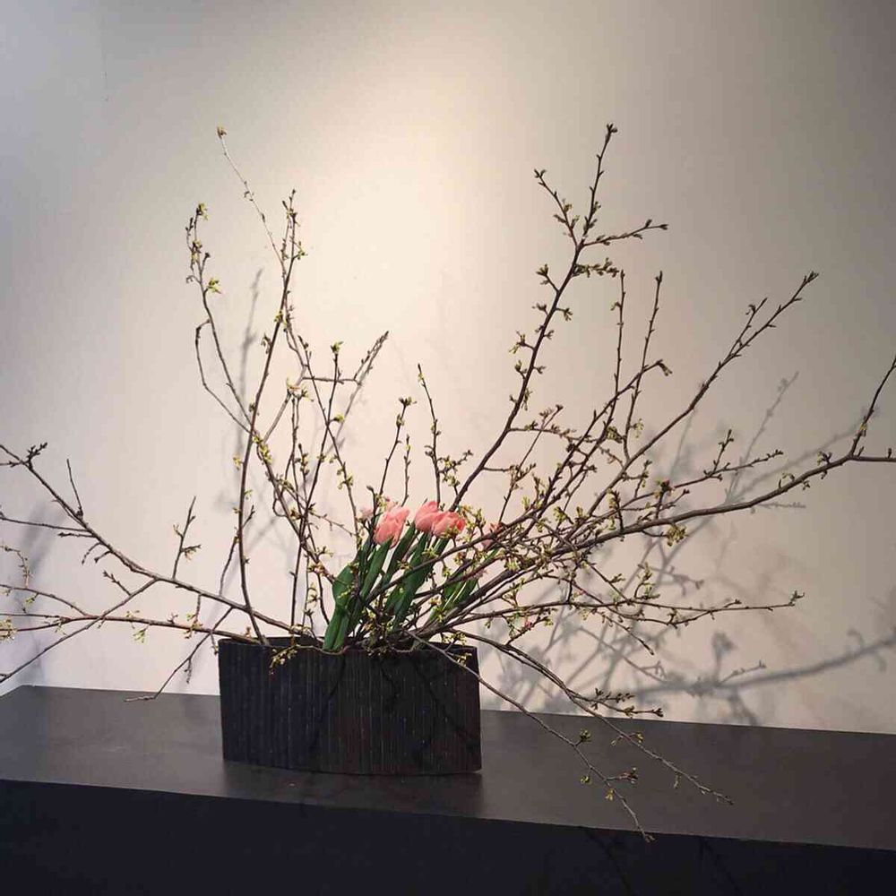 エントランスには河津桜とチューリップ。商談テーブルにはヒアシンスの球根を枝で倒れない様に留めました☺️