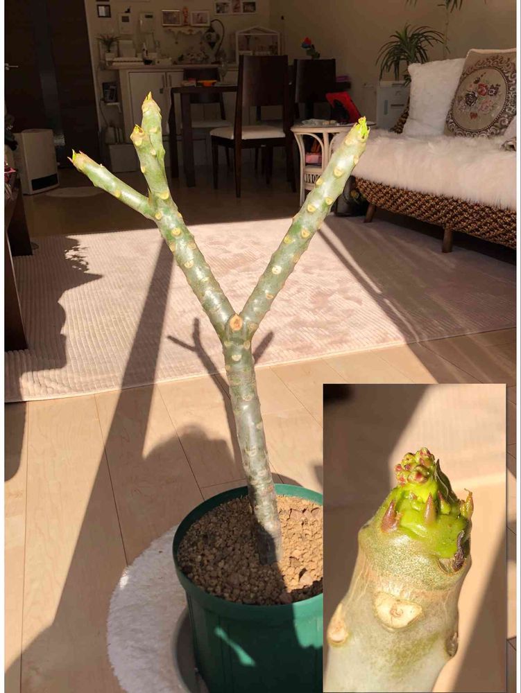 葉っぱの落ちたプルメリア。日光浴中に花芽見つけた!休眠はしていない様子(^ ^)