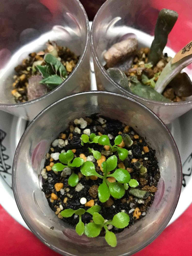 親はもう御臨終で、ひっついてた赤ちゃんだけ外してみたんですけど、辛うじて根っこがちょびっと出ていたので腰水コーナーに入れてみました。