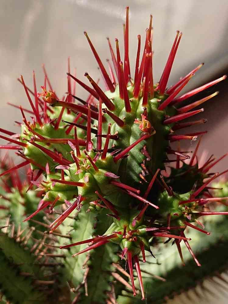 トゲの先端がパカッとしてるのが花みたいね(*´∀`) トゲトゲしっかりしてるけれど痛く無いのよ🎵 赤いトゲトゲが可愛いよ~💓