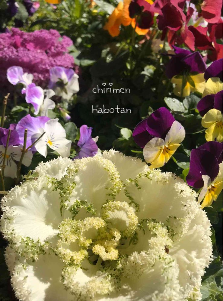 明日から天気崩れそうですが、今日はお花があったかそうでした。中でも葉牡丹のチリメンが開いちゃったっちゃーそうなんですが、何か、丸くて可愛かったので主役に抜擢しました❣️