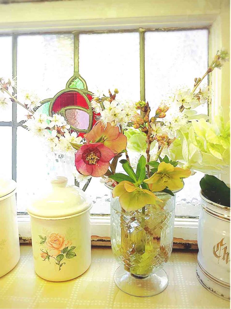 お花は毎年会社の人から頂く早咲きの桜とお庭で咲いたクリスマスローズとお正月の切花で長持ちしてる葉牡丹です♡