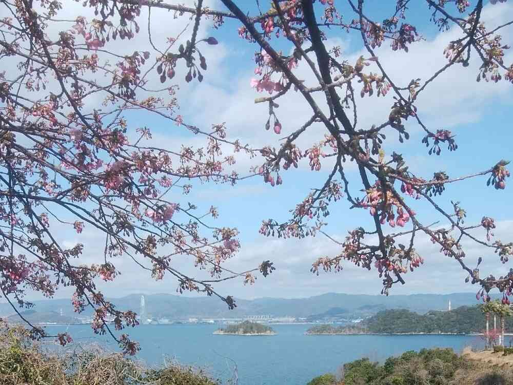 空の青さと、海の青さに、花🌸のピンクがなんとも、いいよー