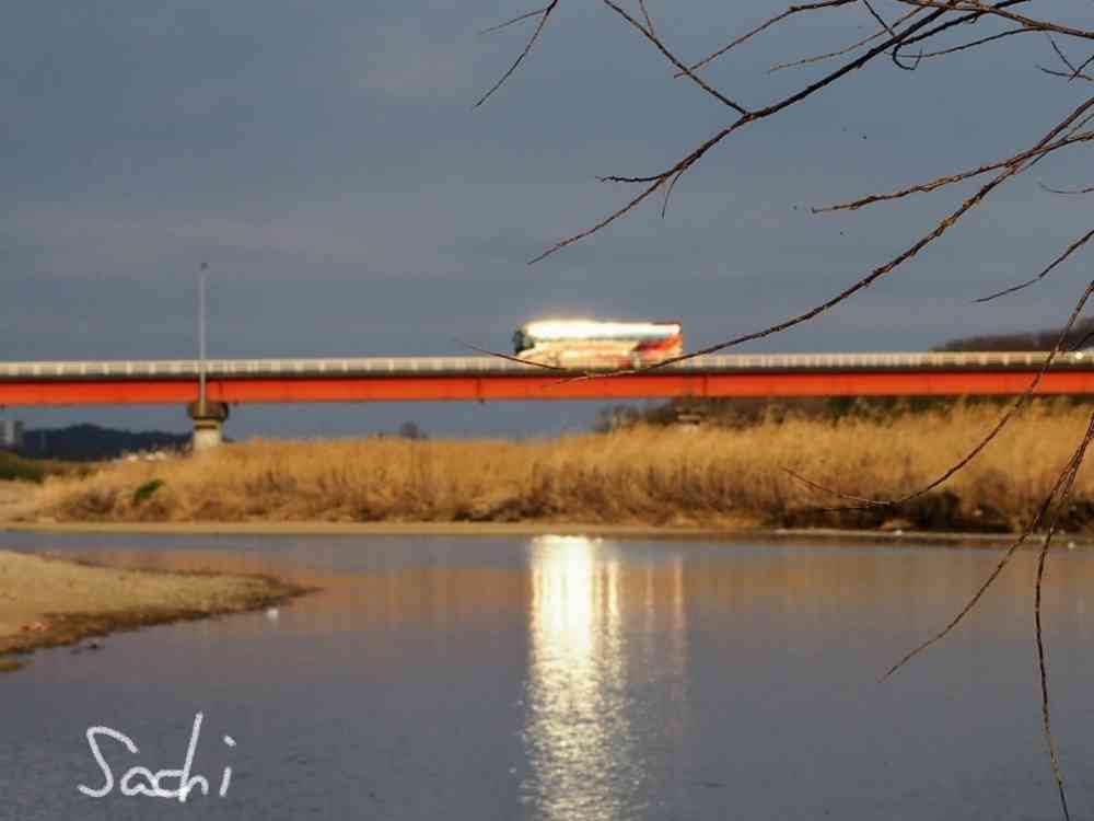 橋の上を走るバスに当たった夕日が反射して川面を照らしました✨✨✨✨✨