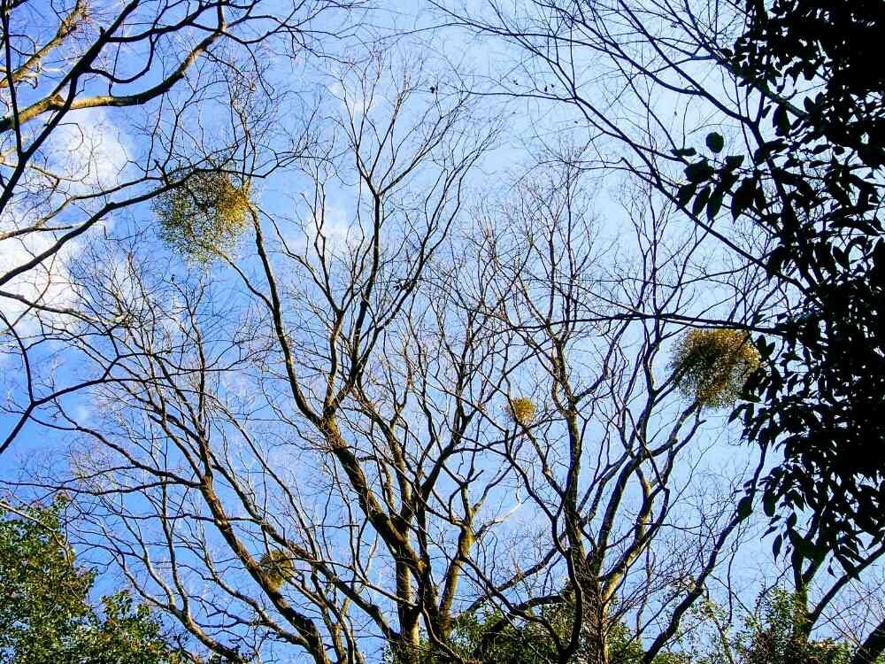 仕事場から、郵便局へ行くときに見上げると丸い宿り木がたくさん見えます。