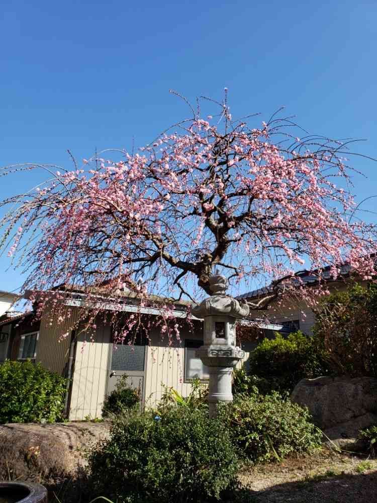 今日は、午後2時過ぎから30分ぐらい、近所の垂れ梅のおばちゃんの庭へ夫婦で行き、花見をさせてもらいました。お土産としてフルーツケーキを持っていき、おばちゃんがコーヒーを入れてくれたので、楽しくおしゃべりをしながら、垂れ梅を見ていました。