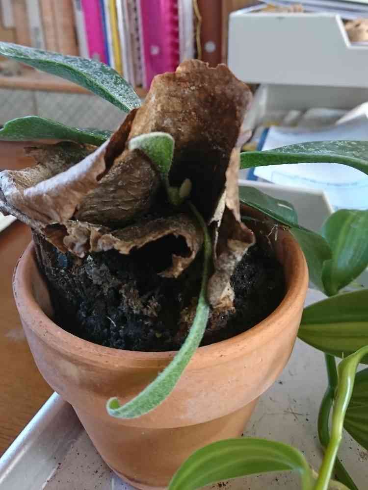 貯水葉の内側から生えている子株。。切り離せずどうしよう。