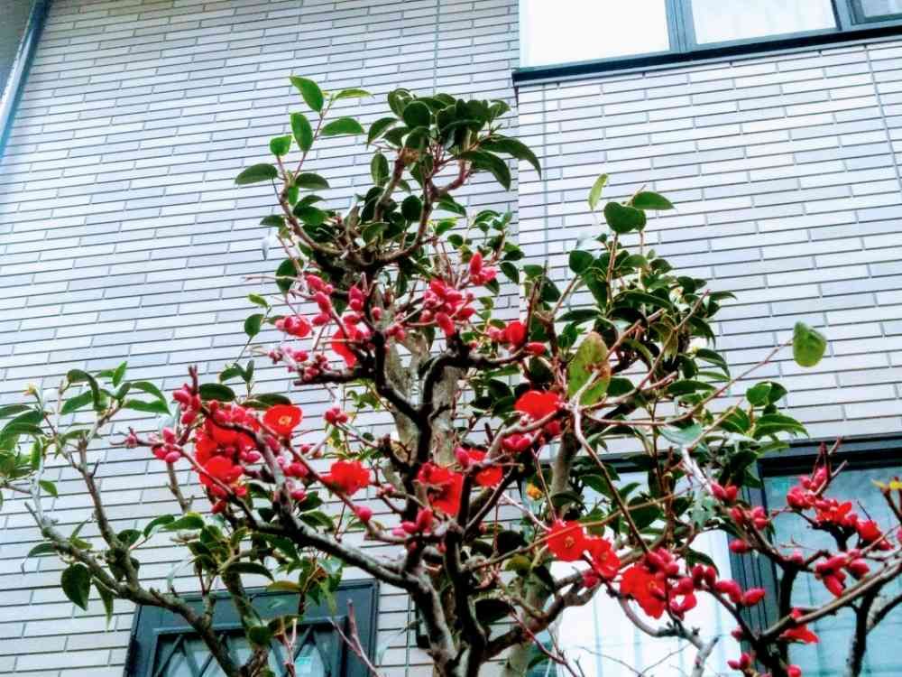 散策の通り道のお宅に、塀からボケの花が、顔を出していました。