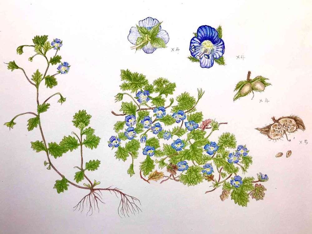 オオイヌフグリの藍色をどのように、白いキャンバスに描くのだろうかと、考えていました。下地が黒や黒っぽい色とでは、藍色の印象が大きく違います。