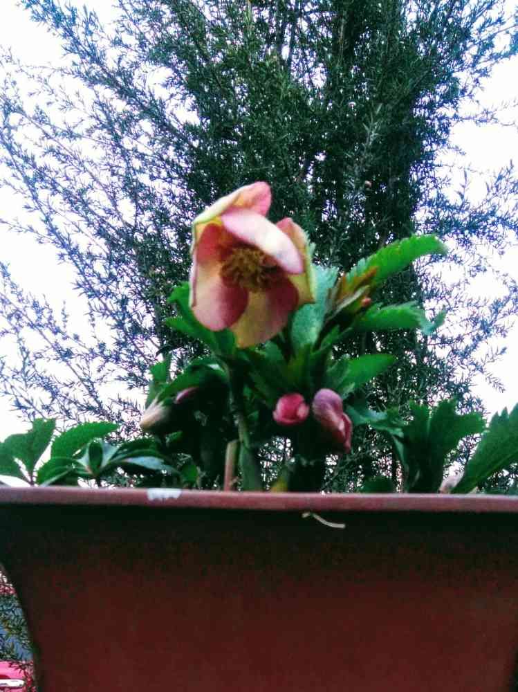 散策の通り道の花壇に、鉢植えのクリスマスローズが、置かれていました。