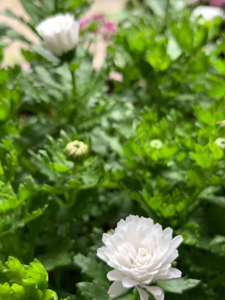 真っ白で八重咲き。とてもきれいです。友だちのユウコさんが買ったので私もと見たら売り切れでした😭