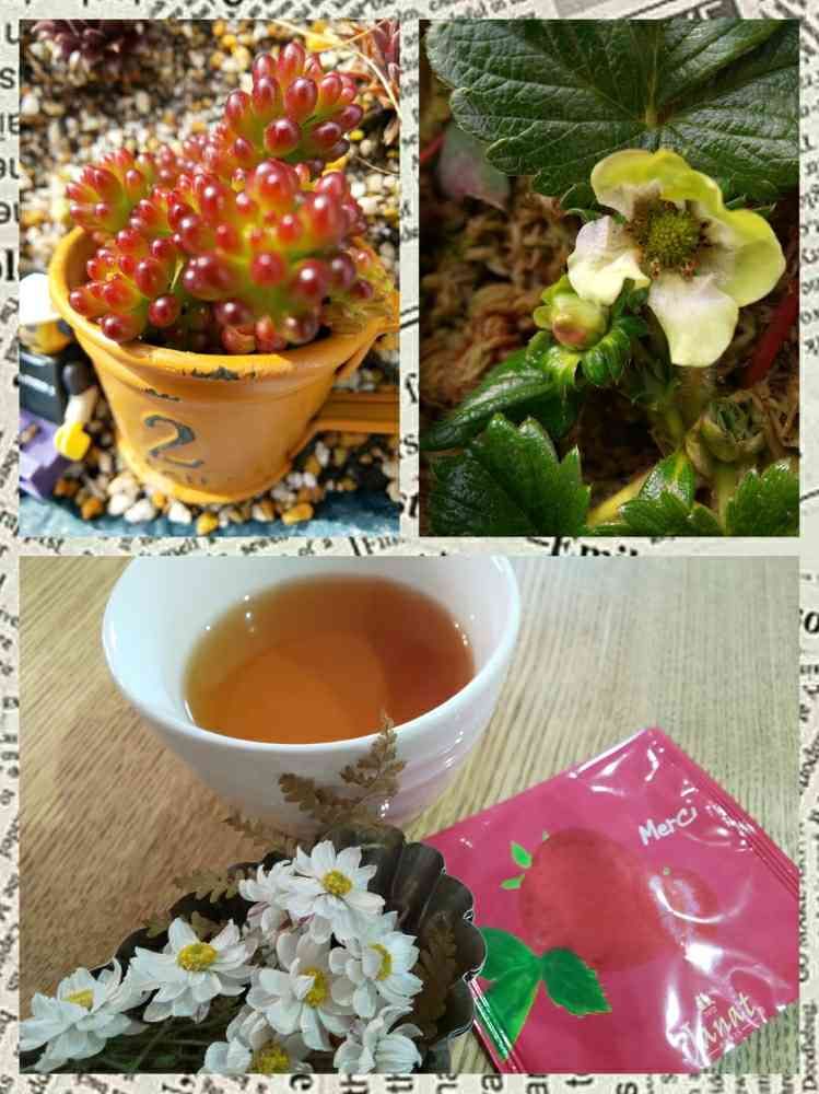 下はカルディで見付けた🍓紅茶☕️ほんのり甘い香り🎶クッキーが合うかなぁって思うけどなかったわ🤣だから花かんざし見ながらティータイム😝