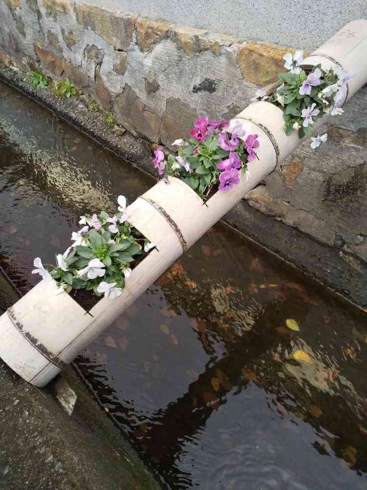 伊丹北村自治会員さんの粋な計らいで竹筒花壇…🌼💗💛💚