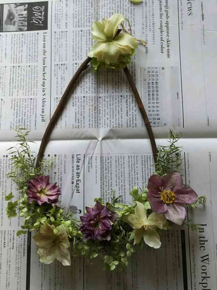 太めの蔓を雫の形に作り、下の部分にボリュームのある🌿を張り付けてバランスをみてローズさんを張り付けます😊