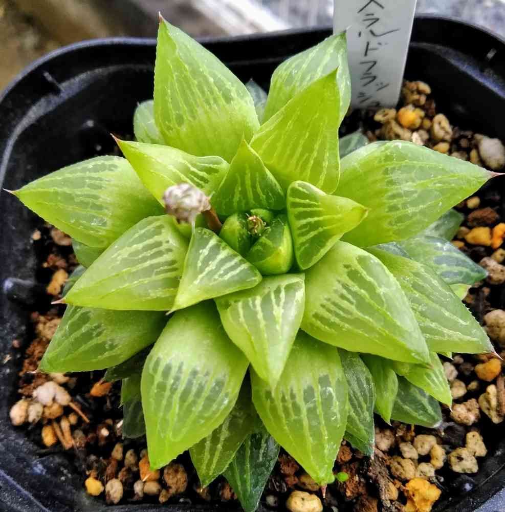 連投失礼します💕ハオルチア9号のオブツーサ水晶の札がついていた🌵エメラルドフラッシュ🌵と思われる子です。通年外置きですがライムグリーンが綺麗💖