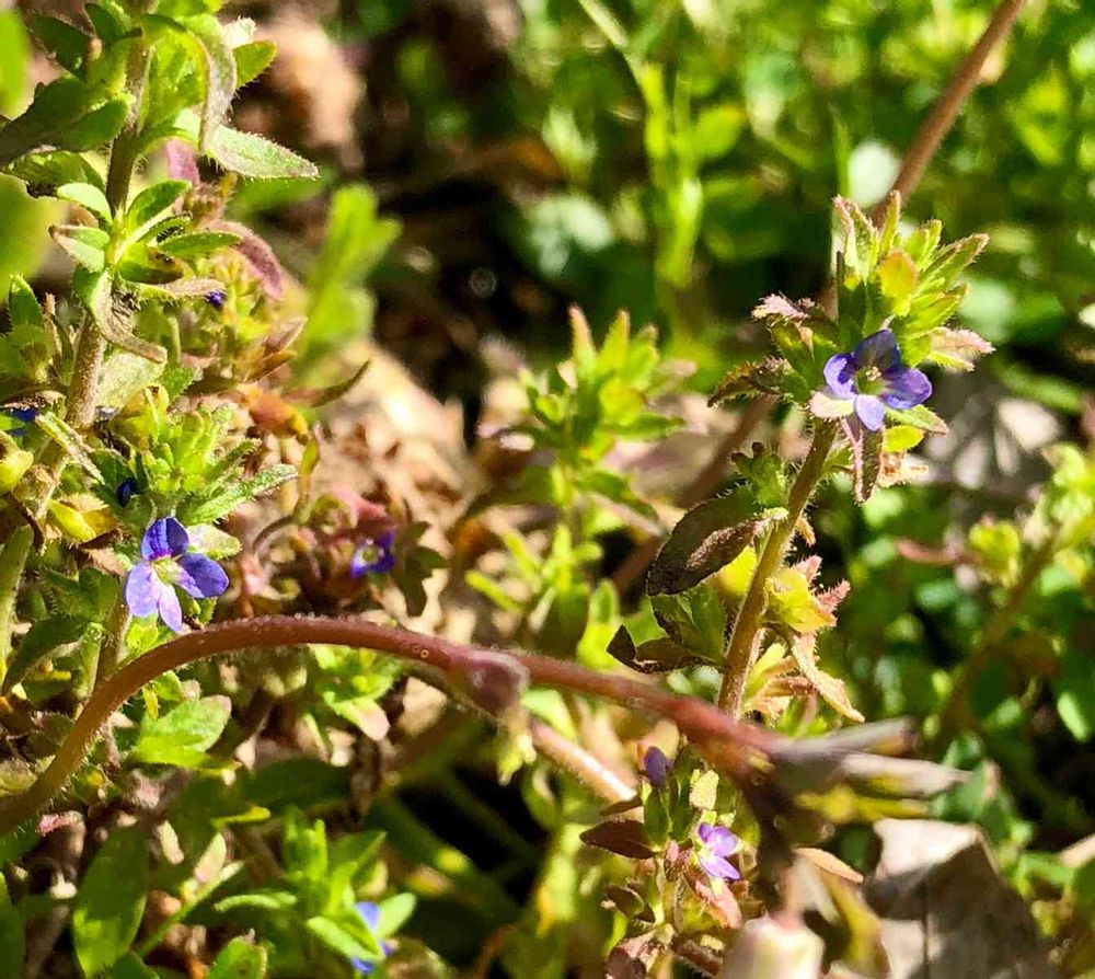 茎の下の方の葉っぱはオオイヌノフグリに形が似ていますが、上の方のお花の近くはとんがった形の細かい葉っぱが沢山あるのが特徴です♫