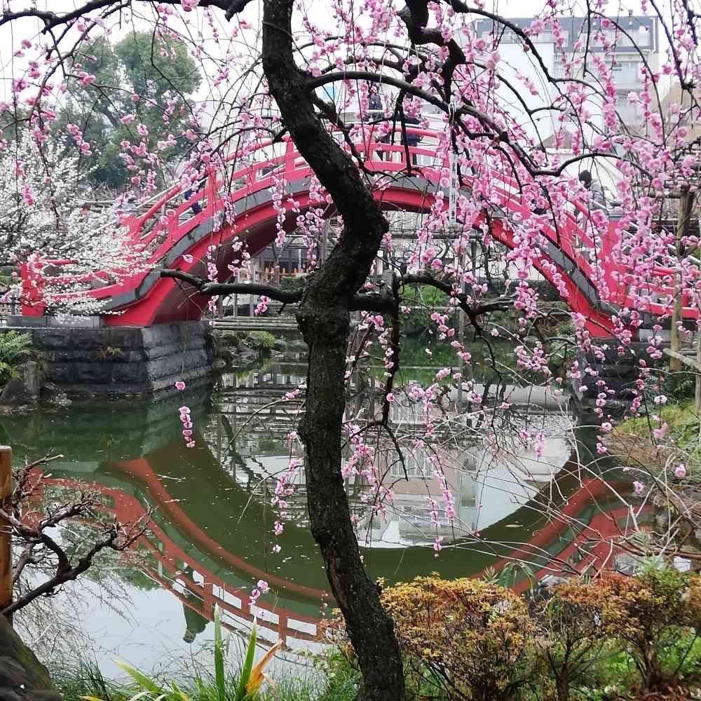 ピンクの紅梅と太鼓橋、情緒あふれる素敵な光景ですね~💕