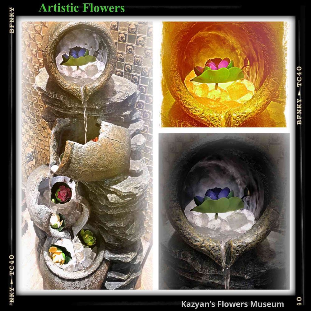 われ思うに、造花なら、管理が容易な分、手が掛からずに、それなりに良いとは考えるが…思案してみると…売り出しのキャンペーンセール中だけの期間限定で、黄金カヅラ:ポトスみたいな生の蔓状の物を、最上部の花器から下方にしだれさせて飾るか、若しくは、螺旋状に絡ませて飾ったら、より造形物の噴水がリアリティな存在となり、臨場感が出て面白いのではないか?…