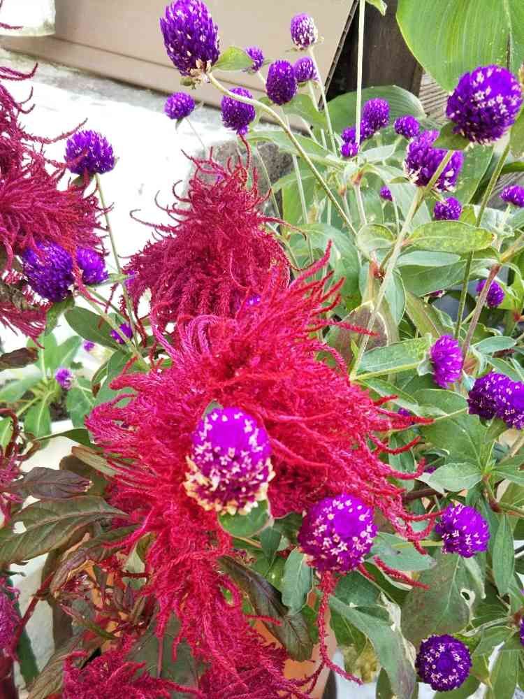 千日紅の周りにウモウケイトウ(初めて見ました)がコラボして、千日紅を包み込んでいる様で目を引きました。
