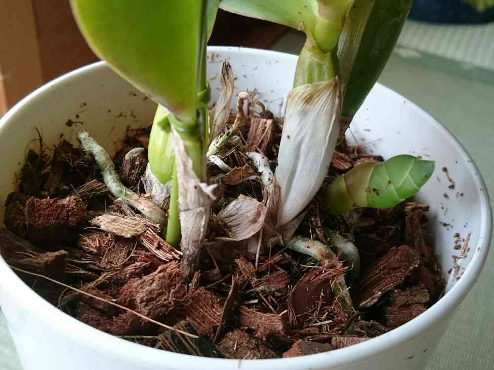 カトレアの花もそろそろ萎んで来たので終わりにしようと思って見ると、新芽が出て来てました。