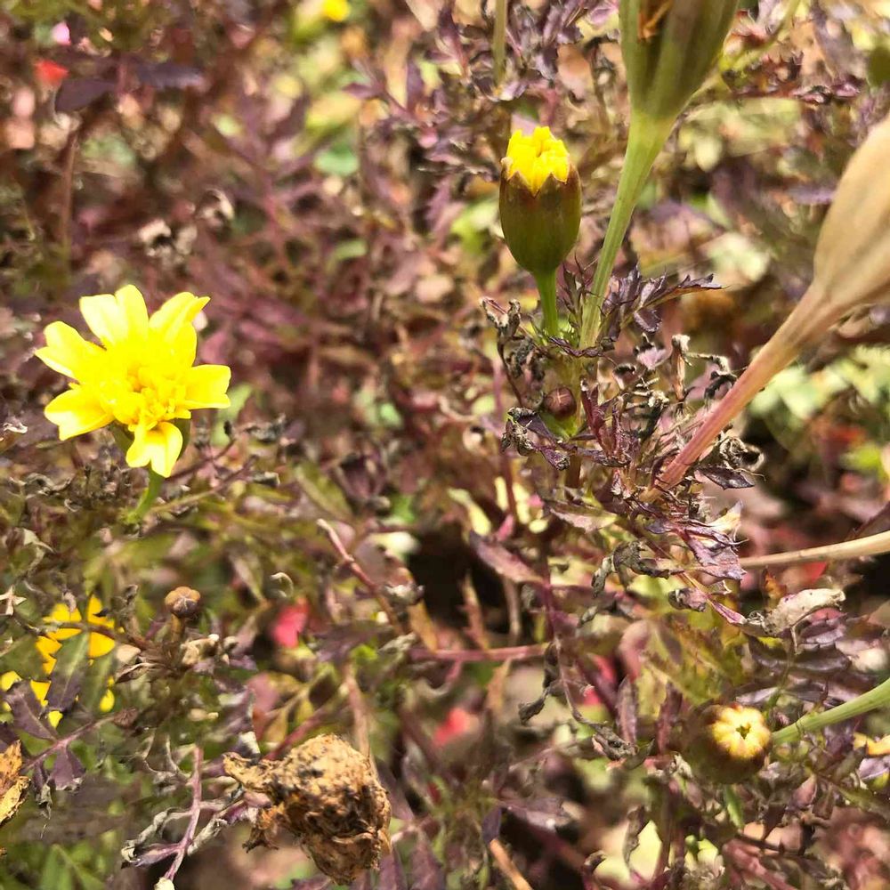 ほぼ枯れてるのに花びらがなかなか散らないなぁ、まぁ次に植える予定もないから良いか、と放置していたフレンチマリーゴールド。新しい蕾がついてるように見える。一年草と紹介されてるのになんで?と思ったら、「(一部多年草)」表記してるサイトも。2年目いっちゃう?