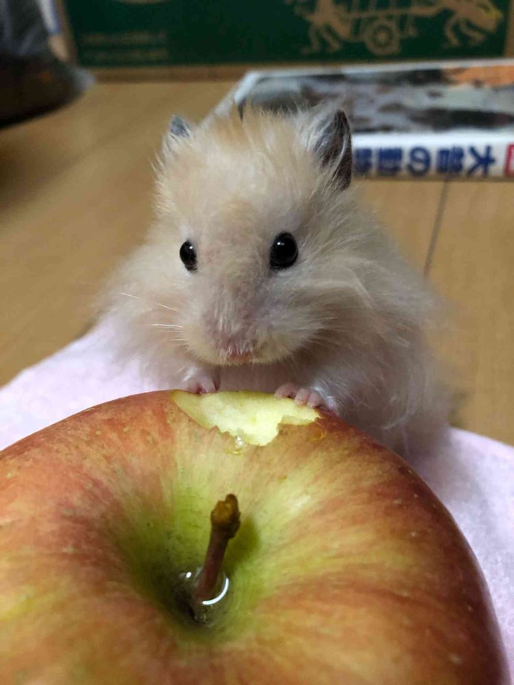 🍎りんごをかじる瞬間は顔怖いですが、座るとまたキョトンとしたこの顔でお食事🐹💕😆