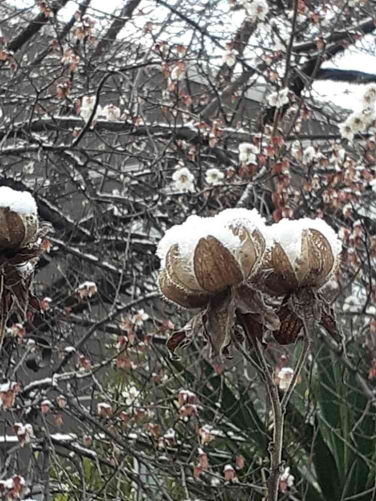 梅の花をバックに芙蓉の実に雪が積もって綿みたいです