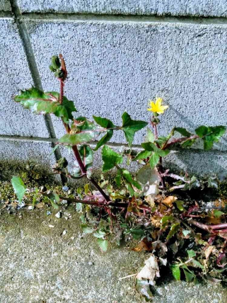 散策の通り道で、ブロックと道路の隙間を見つけたのか、黄色い花を着けた雑草が生えて来ました。
