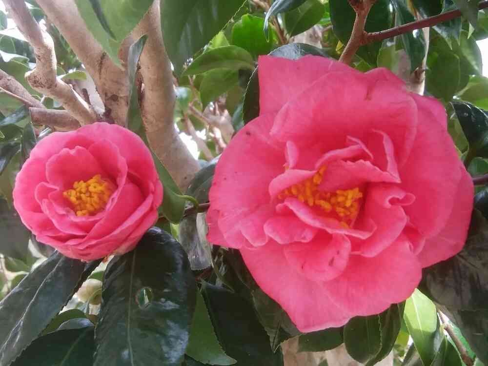 こんにちは。花弁が沢山あって華やかなツバキですね。綺麗に仲良く咲いてますね。☺️♥️