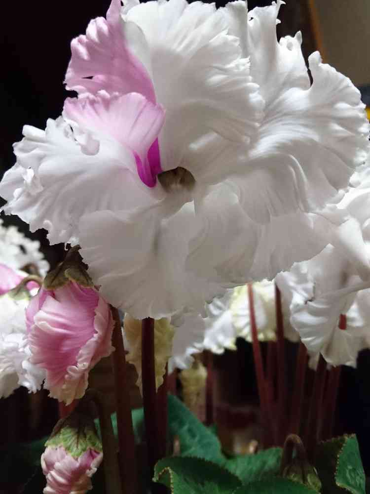 沢山のシクラメンの鉢が並んでいるなかで❇️輝いていたんですよ(*^.^*)真っ白のふりふりの花の中から3個だけピンクのふりふりのシクラメンが、