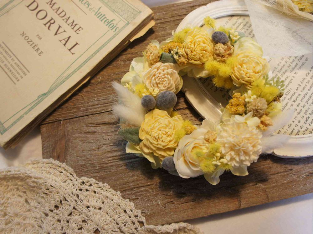 優しいイエローカラーのお花とグレイッシュなオリーブの実が入った春リース。
