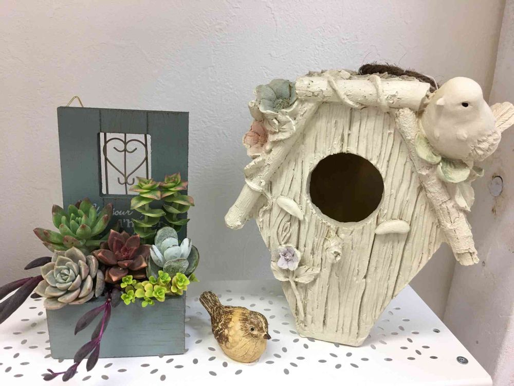 FRP樹脂の鳥小屋と小さな寄せ植え