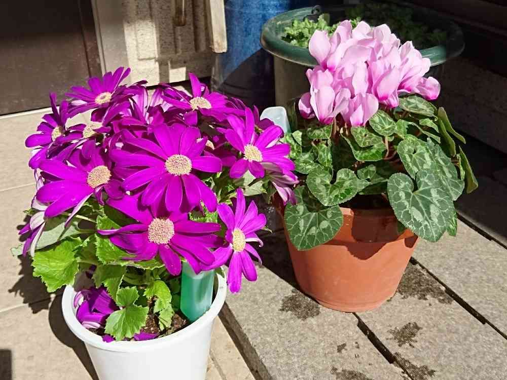 花柄を摘み、玄関の夏越シクラメンさんと一緒に日向ぼっこをさせてみました。( ´_ゝ`)ゞサイネリアとシクラメン、ともに長く花期が楽しめるといいな~😃
