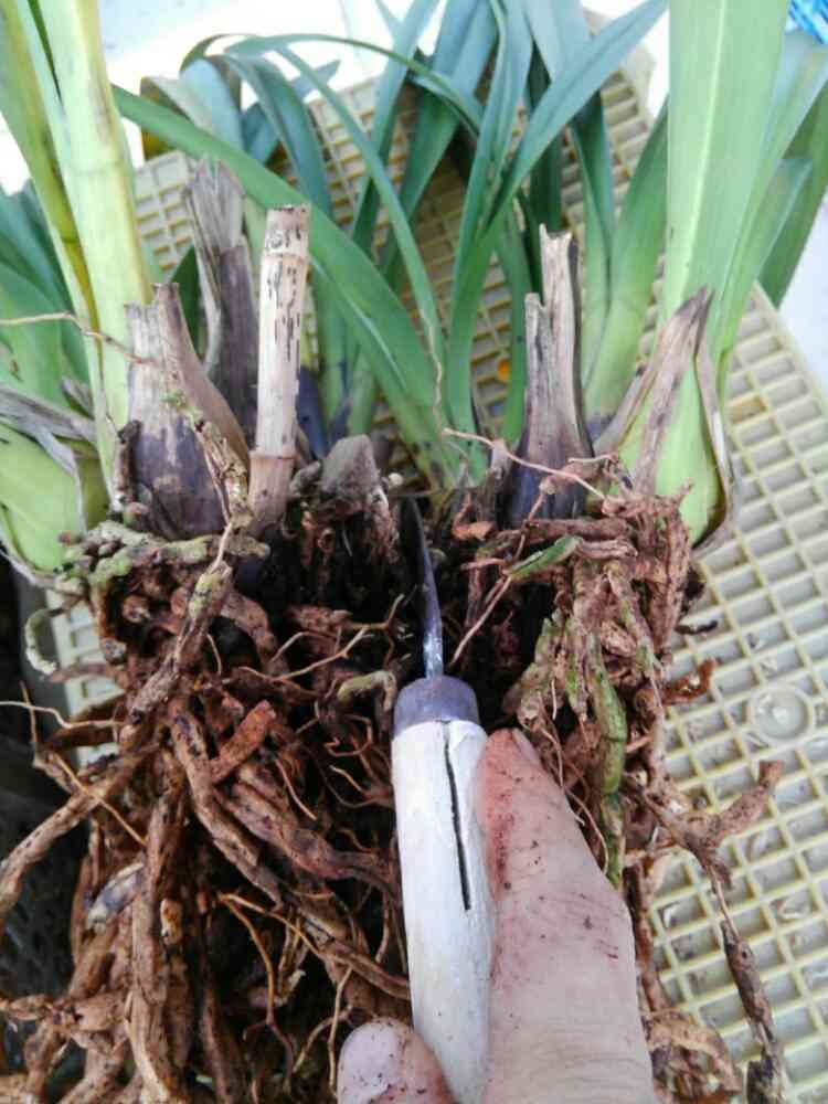 ⑦ノコギリ鎌(またはハサミ)で株分け出来そうな所で切ります。