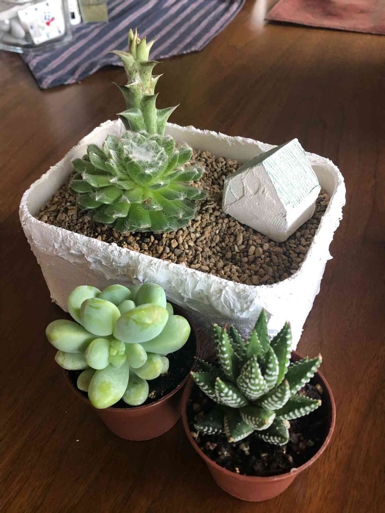 プラ箱に漆喰みたいなものをペタペタして鉢を作り、好きな多肉ひとつと小さなお家を乗せて完成