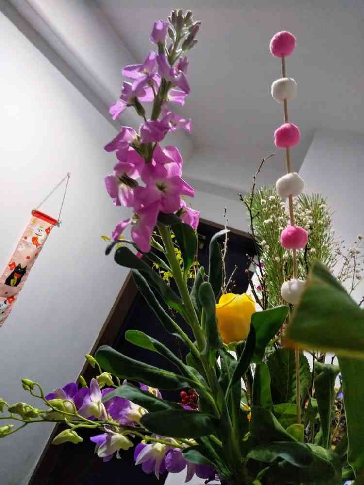 お正月に生けた松、南天、餅飾り、はそのまま2ヶ月…🌿経ってます…ピンクのストックと黄色のバラ、左下のデンファレは先日入れました