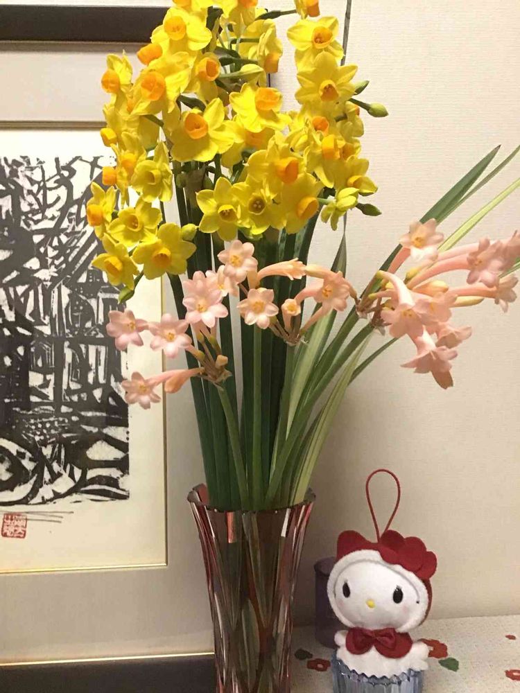 この間から、この 黄色の 房咲きスイセン🌼は、2回ほど 切って 生けたのに、今日 見る👀と、また たくさん 咲きあがって 咲いていました💖