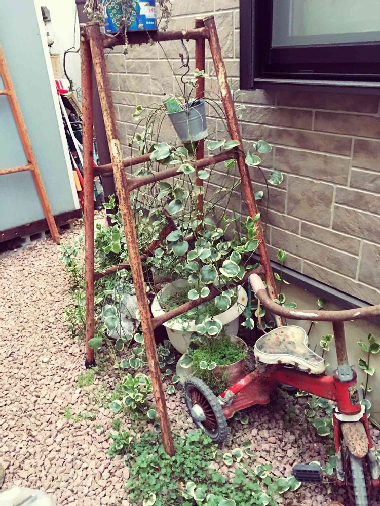 さんへ…やっぱり‼︎ お庭に色々飾ってる方は雨の時?どーしてるのかな❓っていつも投稿みて思ってましたか…やはりみんな雨ざらしなんですね⁉️その雨ざらしが味が出てよいんですよねェー(*´艸`*)笑 脚立もサビサビです。