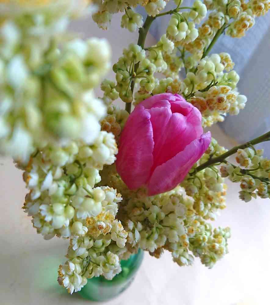 一緒に生けたアオモジも満開でチューリップちょっと埋もれぎみ…😅