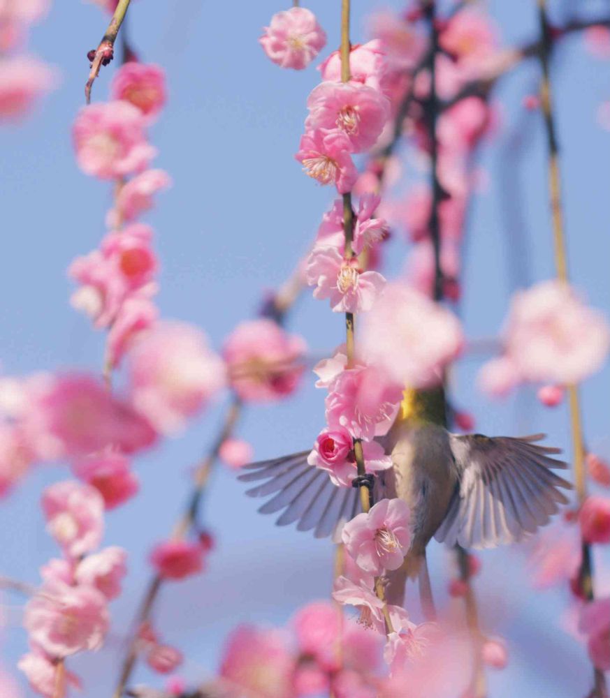 枝垂れ梅と羽ばたくウメジロー😍
