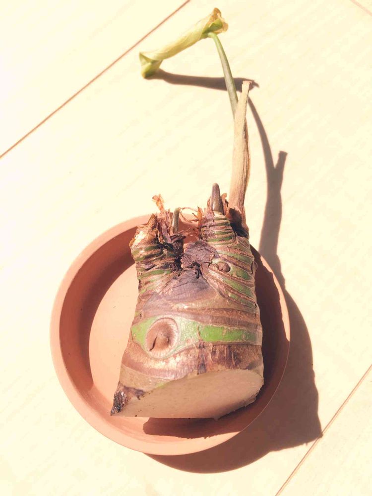 100均根腐れクワズイモ。救出購入したつもりが調子よろしくなく根も出ず葉も枯れ...検索したら復活作戦詳しく書いてある所があり イモ部分が腐ってきたので思い切ってカット❗️しばらく日陰で乾かして植え直します😩頑張れクワズイモ💦