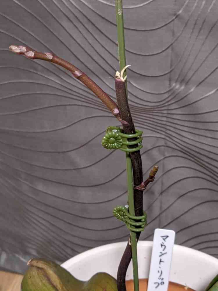 花芽再生中!なんと2箇所から。花芽が2本立つなら最初折ってしまったのも不幸中の幸いではないかと。接ぎ木テープ巻いたりしたけど潔く諦めて、下の節から再生するのを待つのが得策ですね!
