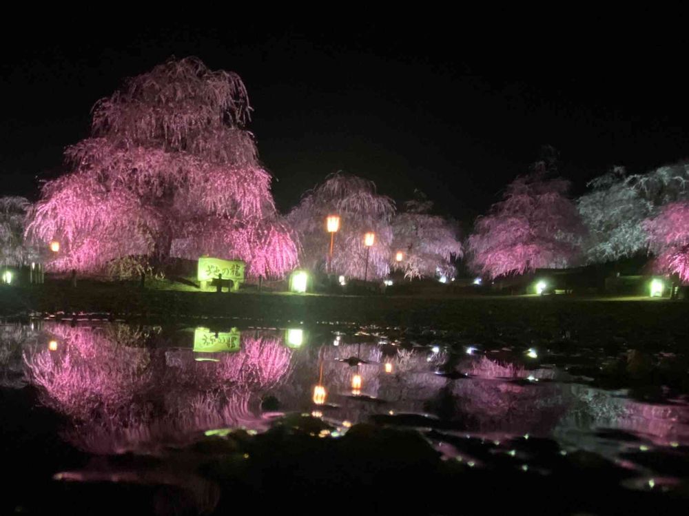 雨が降った日のライトアップはスマホで簡単にこんな写真が撮れるよ。水溜りにスマフォを近づけて取ると水面にしだれ梅が映り込みます。I phon11でシャッタ押すだけの撮影です。インスタ映え間違いなし