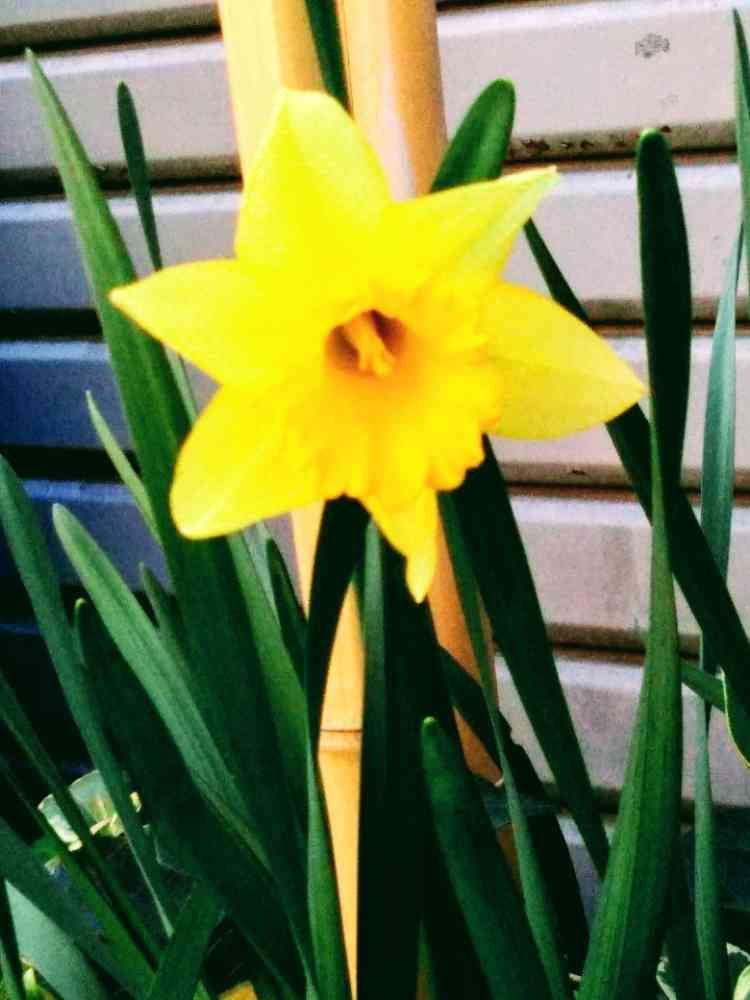 散策の途中で、ご近所の花壇に、ラッパ水仙が咲いていました。