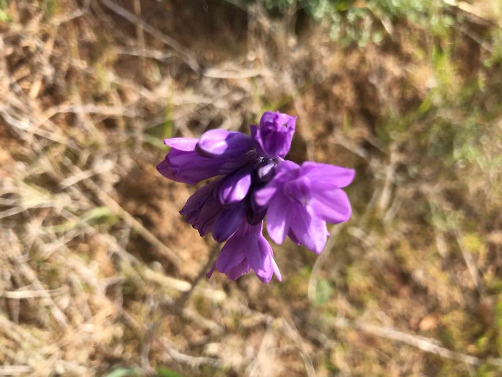 Almaden parkにて。30センチほど伸びた細い茎の先に小さな紫の花がまとまって咲いているのを発見。そよ風に揺れていました。