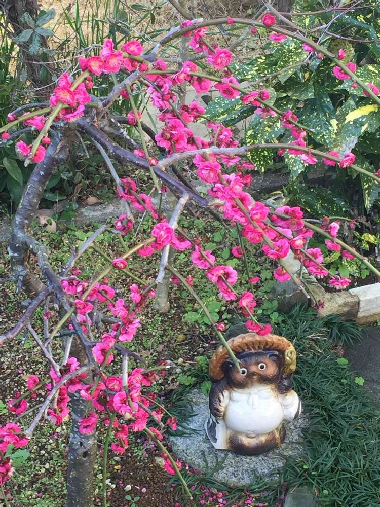 タヌキの置物と枝垂れ梅がいい感じ💕