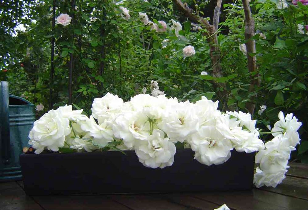 ちょっとわかりづらいですが横長の大きな黒の陶器に白い薔薇(アイスバーグ、新雪など)だけを盛ったアレンジです
