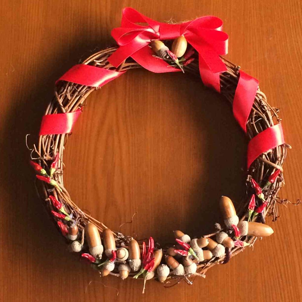 先月、拾ったドングリと、庭の鉢植えの観賞用トウガラシの実を使ってリースを作りました