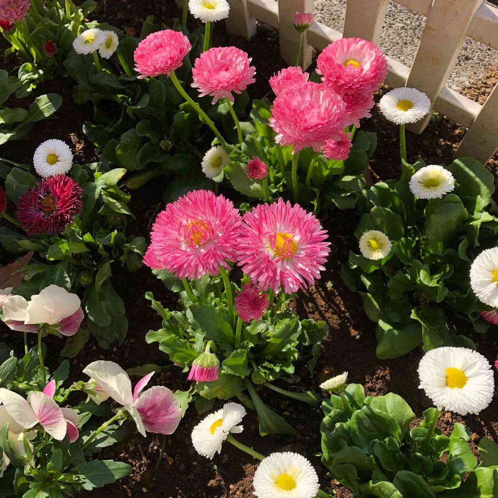 白い子は、ふつうのデイジー…真ん中のピンクの花びらがちょっと長くて、サワサワしてる子がチロリアンデイジー…じゃないかな⁉️