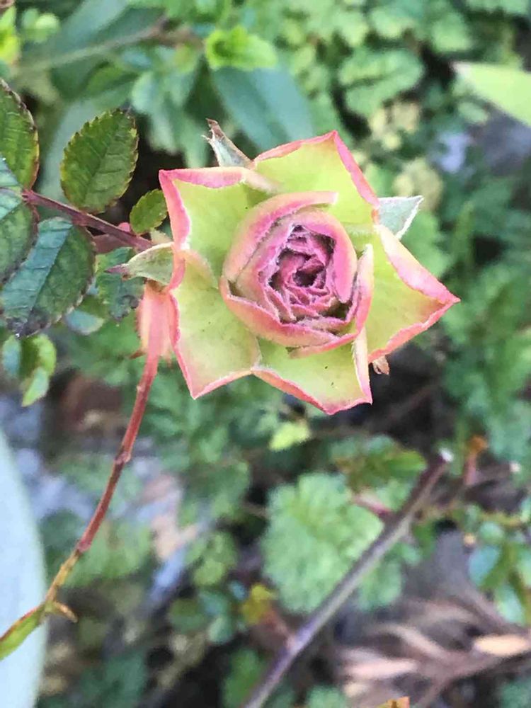 淡いグリーンにピンクの縁取りの変わった可愛い薔薇